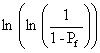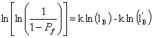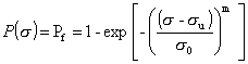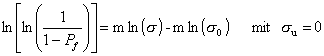 In Gleichung 14 ist die Versagenswahrscheinlichkeit Pf (%) als Funktion der Schwellspannung su (MPa), der charakterischen Festigkeit s0 (MPa) und der Spannung (MPa) dargestellt. Zur Auswertung dieser Häufigkeitsverteilung wird oft das grafische Verfahren der linearen Regression angewendet. Dazu wird die Gleichung (14) durch doppeltes Logarithmieren linearisiert; man erhält Gleichung (15).